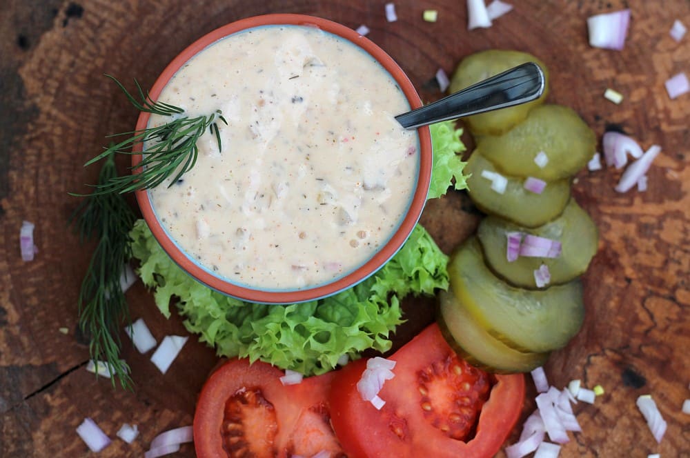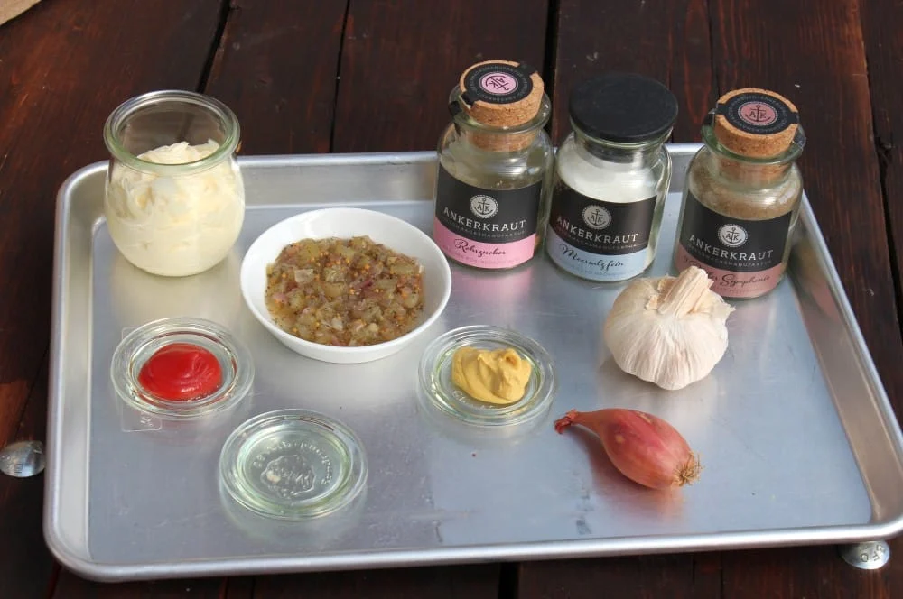 Alle Zutaten für die Sauce in eine Schale gegeben und miteinander verrührt werden. Nachdem alle Zutaten gut miteinander verrührt sind, sollte die Sauce in etwa aussehen wie eine Cocktailsauce. Die Sauce kann jetzt sofort verwendet werden, noch besser wird sie aber, wenn sie für 1-2 Stunden abgedeckt im Kühlschrank durchziehen kann.