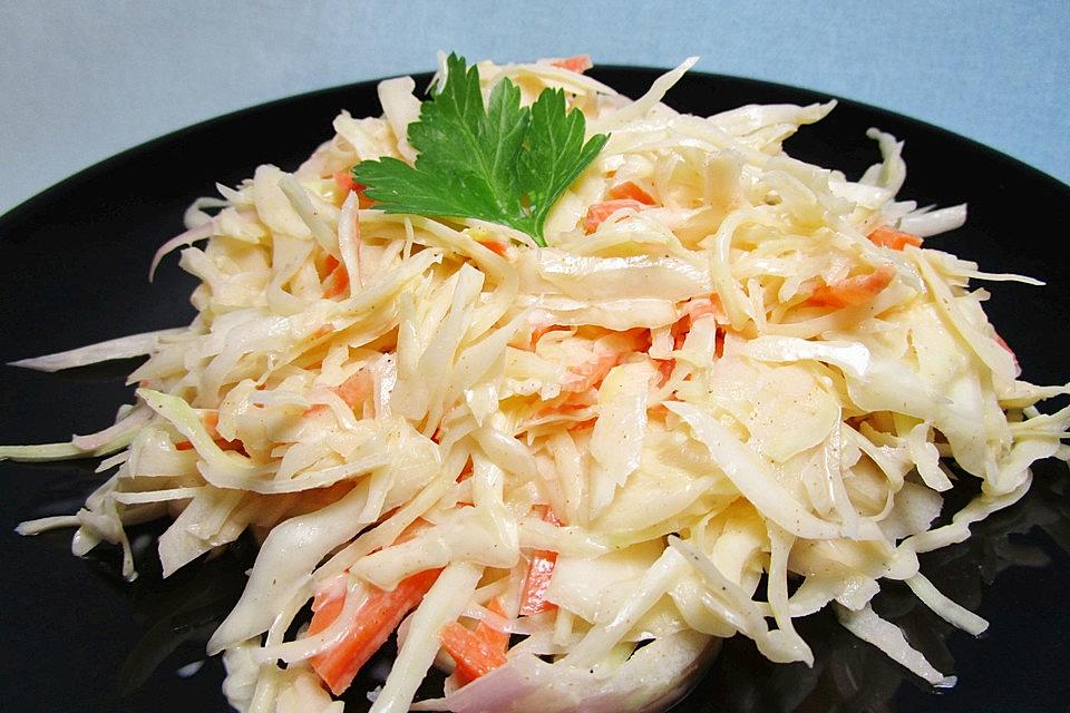 - In einer großen Schüssel Weißkohl, Karotte und Zwiebel vermengen. Die restlichen Zutaten in einer anderen Schüssel gut vermischen, evtl. den Senf auch mit hinzufügen. Danach über die Weißkohlmischung gießen. Abschmecken.