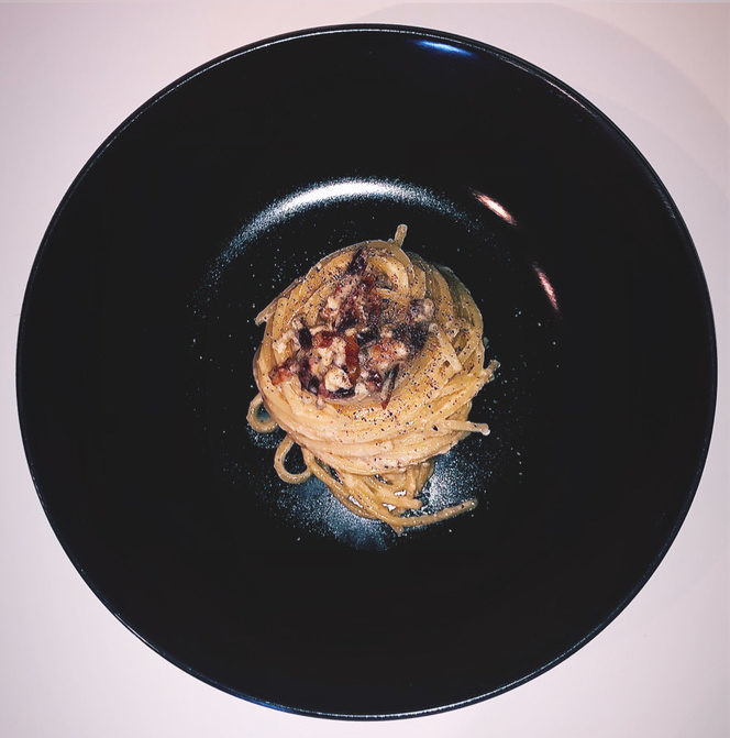 12. Die Pasta auf einen Teller geben und die restliche Guanciale darauf verteilen. Anschließend gemahlenen Pfeffer und etwas geriebenen Käse über die Pasta geben.